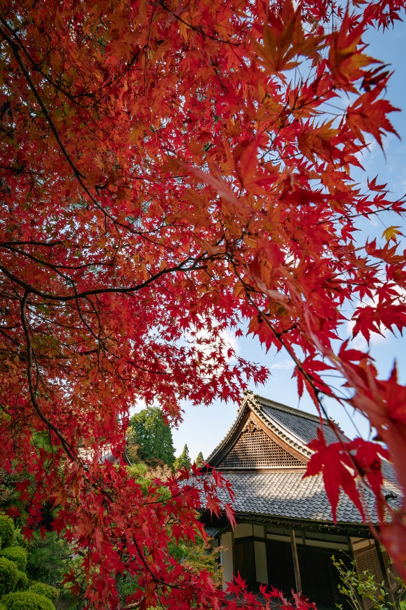 百済寺 喜見院庭園にて撮影しました。 建物がまるで紅葉に包まれているかのようで美しい光景でした。
