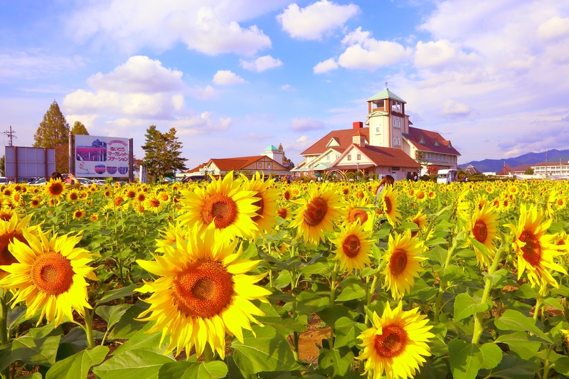 マーガレットステーションにコスモス撮影に訪れると思いがけないヒマワリの咲く光景にビックリ。秋晴れの空には雲も浮かんで良い景色に出会えました。